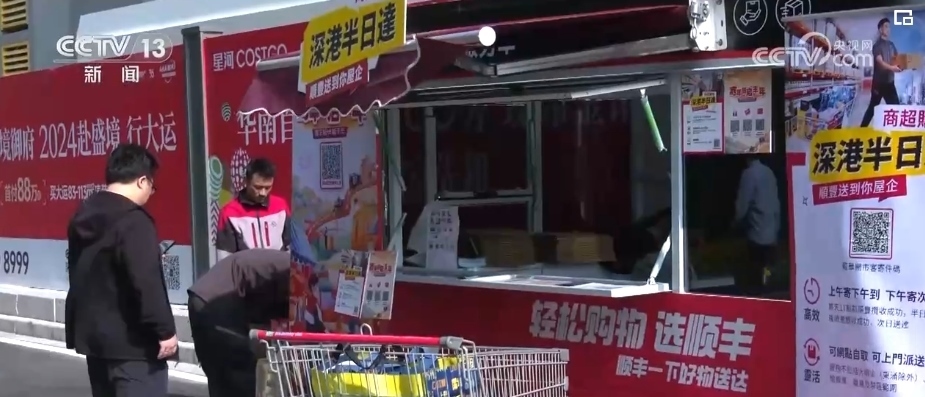 在深圳的這家超市,從出口處向外走兩步,就是快遞公司專門在現(xiàn)場設(shè)置的寄送服務(wù)點。大包、小包的商品從剛剛推出的購物車?yán)锉魂懤m(xù)裝進(jìn)打包箱,即發(fā)即走。港澳消費者大概前腳剛到家,后腳就能收到貨。