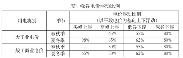 ?。ㄈ┱{(diào)整峰谷電價浮動比例,具體見表2。浮動比例以平段電價為基礎(chǔ),平段電價包含上網(wǎng)電價、上網(wǎng)環(huán)節(jié)線損費(fèi)用、系統(tǒng)運(yùn)行費(fèi)用、輸配電價(不含容(需)電價)、政府性基金及附加。