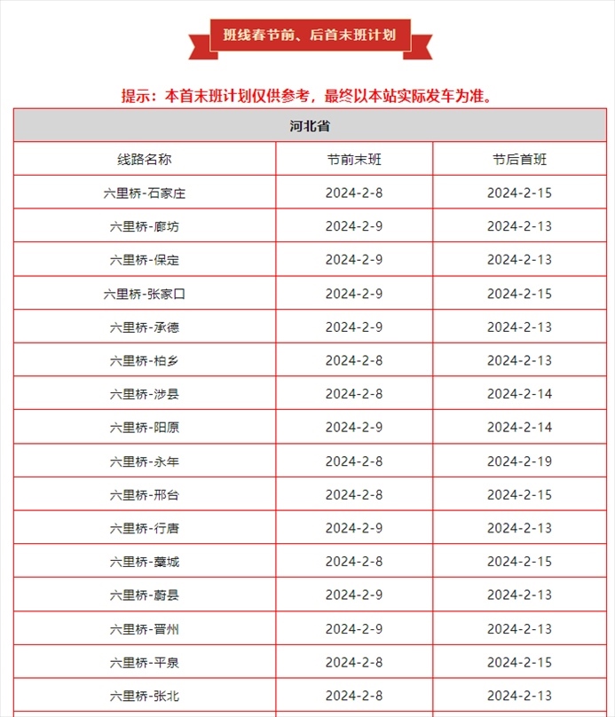 北京六里橋客運(yùn)主樞紐春節(jié)運(yùn)營安排發(fā)布,具體如下: