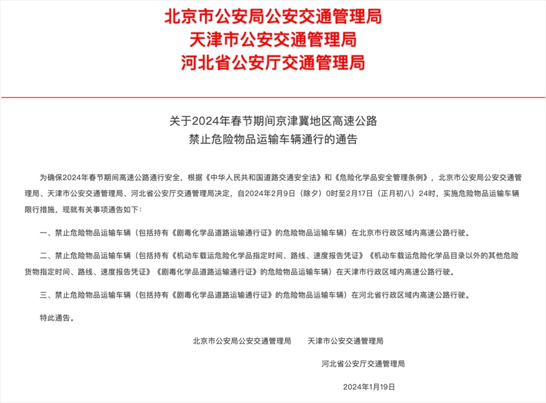 北京市公安局公安交通管理局、天津市公安交通管理局、河北省公安廳交通管理局決定,自2024年2月9日(除夕)0時至2月17日(正月初八)24時,實施危險物品運(yùn)輸車輛限行措施,現(xiàn)就有關(guān)事項通告如下:
