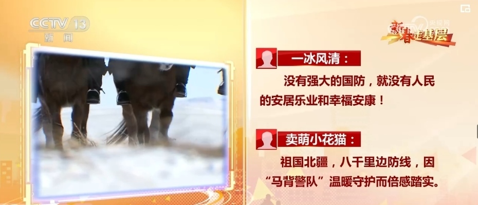 《新春走基層·馬背警隊(duì):風(fēng)雪中的溫暖守護(hù)》播出后,有網(wǎng)友說(shuō):“沒(méi)有強(qiáng)大的國(guó)防,就沒(méi)有人民的安居樂(lè)業(yè)和幸福安康!”。也有網(wǎng)友說(shuō):“祖國(guó)北疆,八千里邊防線,因“馬背警隊(duì)”溫暖守護(hù)而倍感踏實(shí)?!?br>