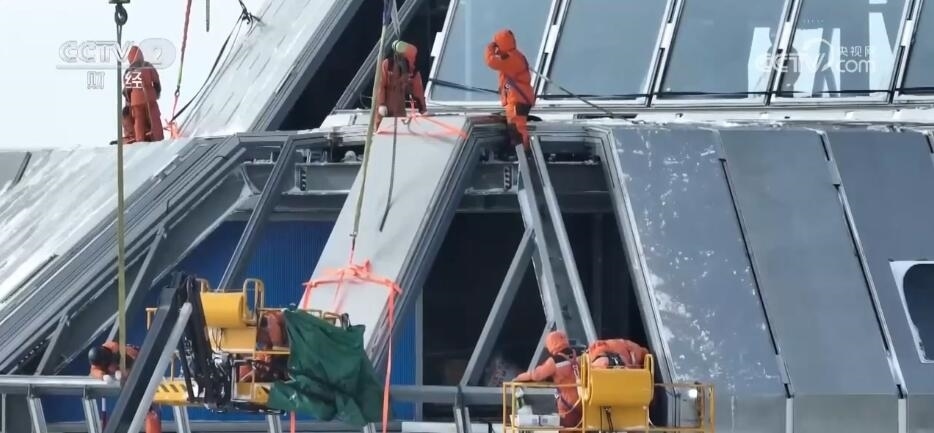 800多斤的幕墻板在大風的作用下,就像飄在空中的樹葉,非常難以控制。此時,現(xiàn)場的風力已經(jīng)增加到了8級,氣溫驟降。40分鐘之后,在現(xiàn)場所有隊員的配合下,第一塊板終于穩(wěn)穩(wěn)的就位了。緊接著是第二塊、第三塊。盡管已經(jīng)在風雪中奮戰(zhàn)了十幾個小時,但大家的臉上依然掛滿了微笑。凌晨12點半,最后一塊板終于順利安裝到位,新站迎風面實現(xiàn)了全封閉,大家也終于放心了。