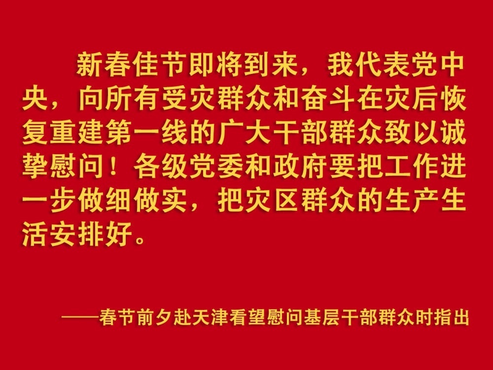 春節(jié)前夕,習(xí)近平總書(shū)記在天津考察調(diào)研,看望慰問(wèn)基層干部群眾。2月1日上午,他首先來(lái)到西青區(qū)辛口鎮(zhèn)第六埠村,實(shí)地了解去年洪澇災(zāi)害后當(dāng)?shù)剞r(nóng)業(yè)生產(chǎn)恢復(fù)等情況,看望受災(zāi)群眾。