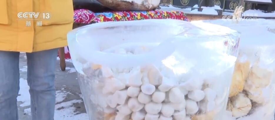 不僅是商品非常有特色,大家來看,這個(gè)裝粘豆包的大缸非常結(jié)實(shí),晶瑩剔透。它是用水桶為模具,內(nèi)部裝水,在室外凍上一個(gè)晚上,脫模后就成了一個(gè)天然冰箱,在鄉(xiāng)村,各家年貨、凍貨都可以儲(chǔ)存在這里,整個(gè)冬天都沒有問題,既保鮮又節(jié)約空間。大集上,還有對(duì)聯(lián)、福字、鄉(xiāng)村土特產(chǎn),充滿濃濃的鄉(xiāng)土氣息。