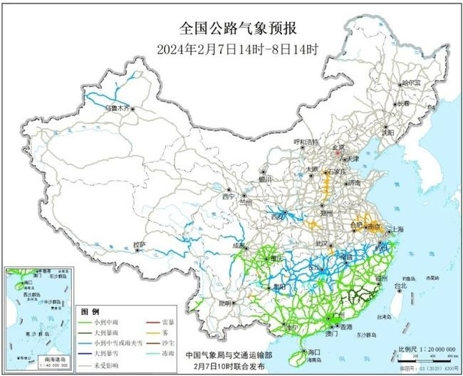 預(yù)計(jì)2月7日下午至8日下午,新疆西北部、青藏高原東部、川西高原北部和中部、貴州西部和東部、湖南北部和中部、江西北部、浙江北部等地部分地區(qū)有小到中雪或雨夾雪;貴州西部、湖南中部等局地有凍雨;江西東南部、福建南部等地部分地區(qū)有大雨。另外,河北南部、河南北部和西南部、江蘇西南部、安徽東部、湖北東南部等地部分道路受霧影響能見度低(見圖3,附件1)。
