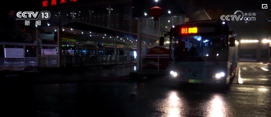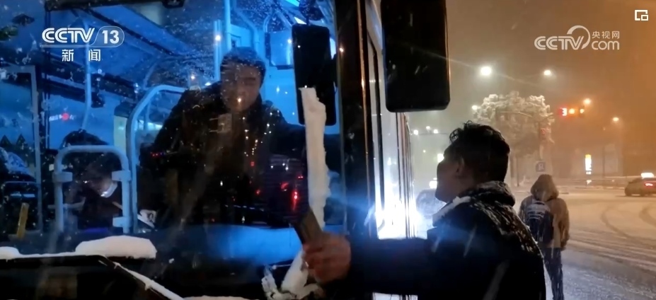 看到一些帶著小孩和老人的乘客沒能擠上車,站在風(fēng)雪中焦急等候,黃勁松和隊(duì)友們走上前,帶著他們前往公交站場(chǎng),提前上車等候發(fā)班。凌晨1時(shí)10分,第二趟加班車從車場(chǎng)出發(fā)了。