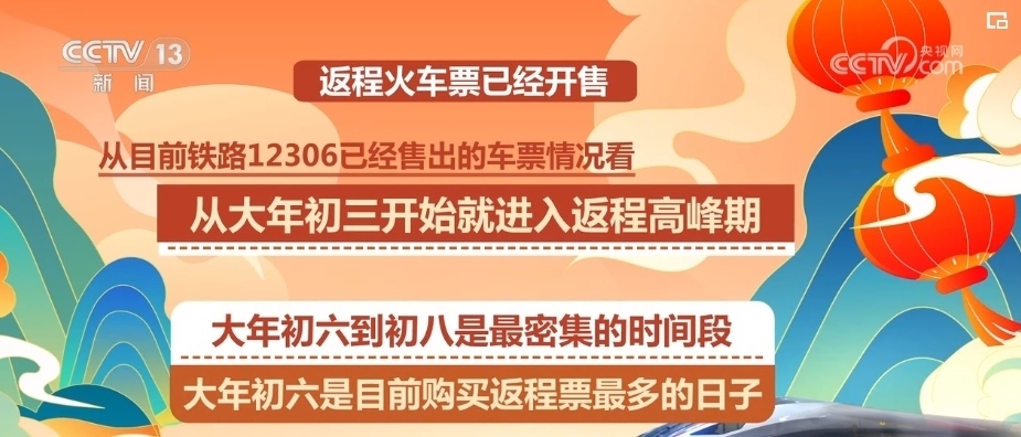 春節(jié)的返程火車票已經(jīng)開售,從目前鐵路12306已經(jīng)售出的車票情況看,從大年初三開始就進入大家返程的高峰期,大年初六到初八是最密集的時間段,其中,大年初六是目前購買返程票最多的日子。