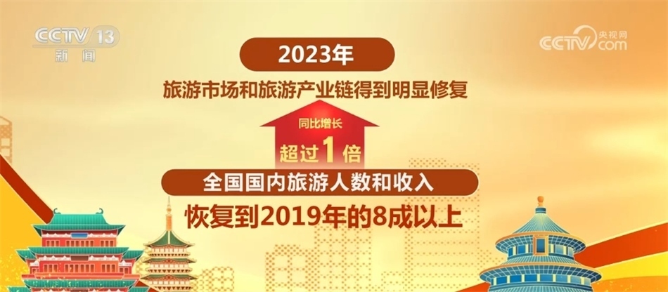 2023年,旅游市場和旅游產業(yè)鏈得到明顯修復,全國國內旅游人數(shù)和收入同比增長超過1倍,恢復到2019年的8成以上;入出境旅游人數(shù)超過1.9億人次,較上一年增長2.8倍以上。