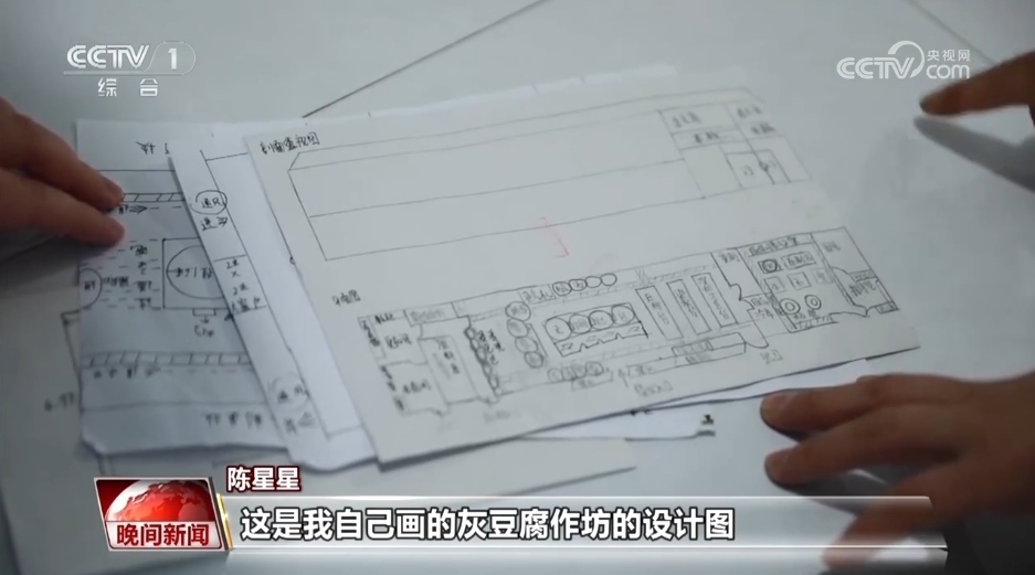 陳星星:這是我自己畫的灰豆腐作坊的設計圖。我們之前用傳統(tǒng)的在家里做的這種方式做出來的豆腐的話,一天最多可能就是一兩百斤的樣子,那么經(jīng)過我們這樣的一個改進的話,一天可能能達到一兩千斤的產(chǎn)量。