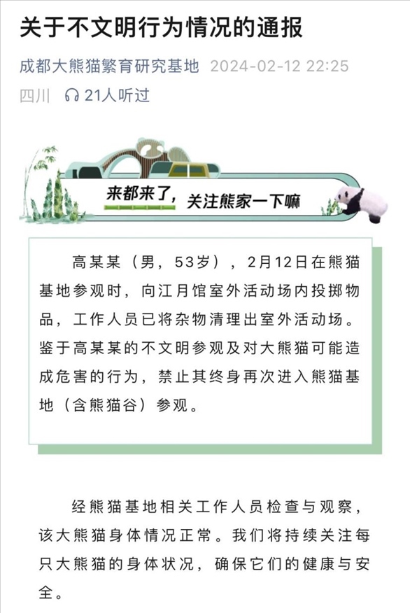 ·一游客在成都大熊貓基地參觀時向場內投擲物品,被終身禁入。