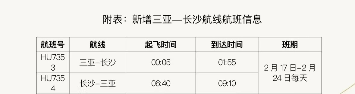據(jù)悉,在民航局、海南省交通廳的支持下,海南航空積極協(xié)調(diào)申請加班計劃。2月17日至24日期間,海南航空每日新增三亞—長沙往返航班。去程航班HU7353,從三亞起飛時間為凌晨 00:05,到達長沙黃花國際機場時間為01:55;返程航班HU7354,從長沙起飛時間為06:40,到達三亞鳳凰國際機場時間為09:10,以上航班信息以實際查詢?yōu)闇?。旅客可通過海南航空官網(wǎng)及APP、微信公眾號及小程序、服務(wù)熱線95339、各直屬售票處及授權(quán)代理購買機票。