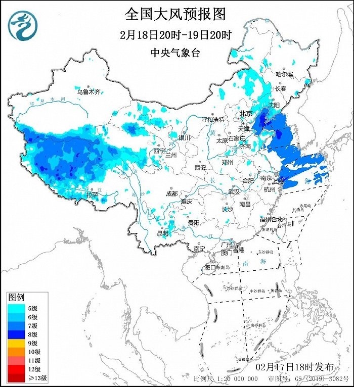 2月18日20時至19日20時,西藏中西部、青海南部、甘肅河西、內蒙古西部和中部、遼寧西部和南部等地將有5~6級、陣風7~9級的大風;渤海、渤海海峽、黃海大部海域、東海北部海域將有7~8級、陣風9~10級的大風。