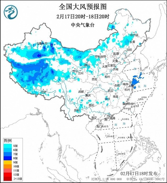 預計,2月17日20時至18日20時,新疆北疆東部和南疆盆地、西藏中西部、青海西部和北部、甘肅河西、內蒙古中西部、吉林西部等地將有5~7級、陣風8~9級的大風。