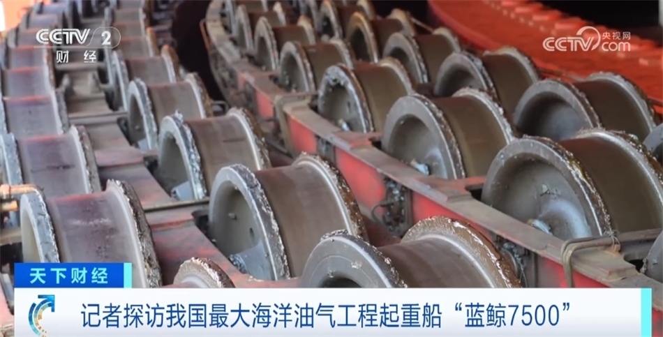 這個(gè)巨型吊機(jī)不僅力氣很大,還很靈活,它下面有個(gè)大轉(zhuǎn)盤,50多個(gè)人才能環(huán)抱一圈,里面有近900個(gè)滾輪,能夠控制吊機(jī)靈活地轉(zhuǎn)動(dòng),把組塊送到準(zhǔn)確的位置。
