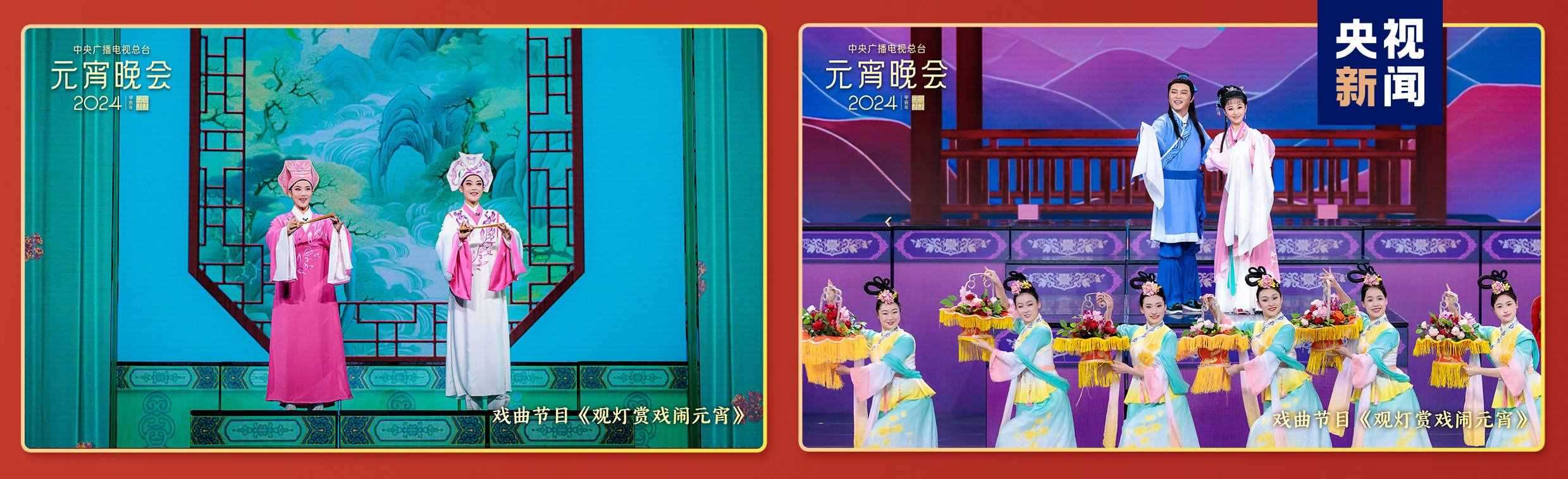戲曲節(jié)目中,伴隨著“火樹(shù)千春妍,元夕月正圓,歡歌笑語(yǔ)喧”的戲腔戲韻,閩劇戲歌首次亮相總臺(tái)元宵晚會(huì)。其他劇種還玩上了跨界表演,熟悉的旋律響起,站在舞臺(tái)上的表演者卻是令人直呼意外的“混搭”組合。陳麗君與黃齡攜手帶來(lái)越劇《梁?!愤x段,潘檸?kù)o與沙溢共唱黃梅戲《天仙配》,在上元之夜演繹傳世愛(ài)情故事,“戲曲真的出圈了”“誰(shuí)說(shuō)年輕人不聽(tīng)?wèi)颍肋h(yuǎn)為經(jīng)典唱段打call”。