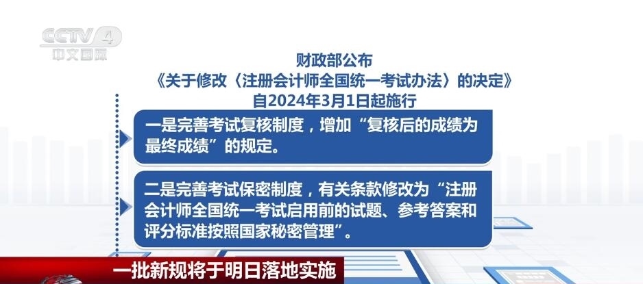財政部公布《關(guān)于修改〈注冊會計師全國統(tǒng)一考試辦法〉的決定》,自2024年3月1日起施行。《決定》共修改2條。一是完善考試復(fù)核制度,增加“復(fù)核后的成績?yōu)樽罱K成績”的規(guī)定。二是完善考試保密制度,有關(guān)條款修改為“注冊會計師全國統(tǒng)一考試啟用前的試題、參考答案和評分標(biāo)準(zhǔn)按照國家秘密管理”。
