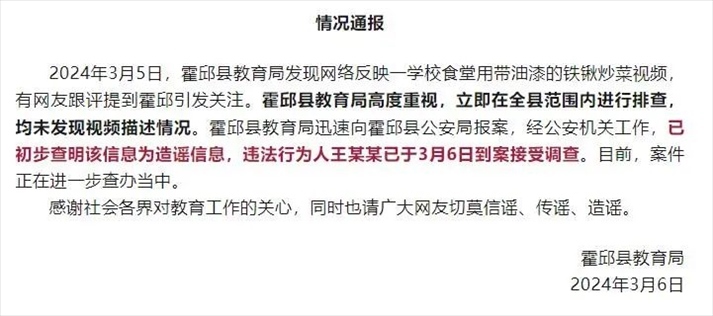 ·安徽霍邱縣教育局辟謠“學校食堂用帶油漆的鐵鍬炒菜”:造謠者已到案。