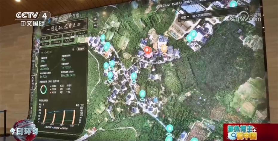 五四村的村干部還帶來了更多驚喜:“帶你去看看我們整個(gè)村的數(shù)字鄉(xiāng)村是如何治理的。整個(gè)一張圖里面所展示的是我們整個(gè)村的發(fā)展。這個(gè)圖是2019年建設(shè)的,也是整個(gè)浙江省在五四村率先打造的‘一圖全面感知’,總共有全縣的各個(gè)部門58個(gè)、282類數(shù)據(jù),總共有12個(gè)這樣的數(shù)據(jù)接口連入到了5個(gè)城市大腦應(yīng)用,形成了這樣一個(gè)時(shí)時(shí)可以感知農(nóng)村的生產(chǎn)、生活、生態(tài)詳情的數(shù)字化體系?!?