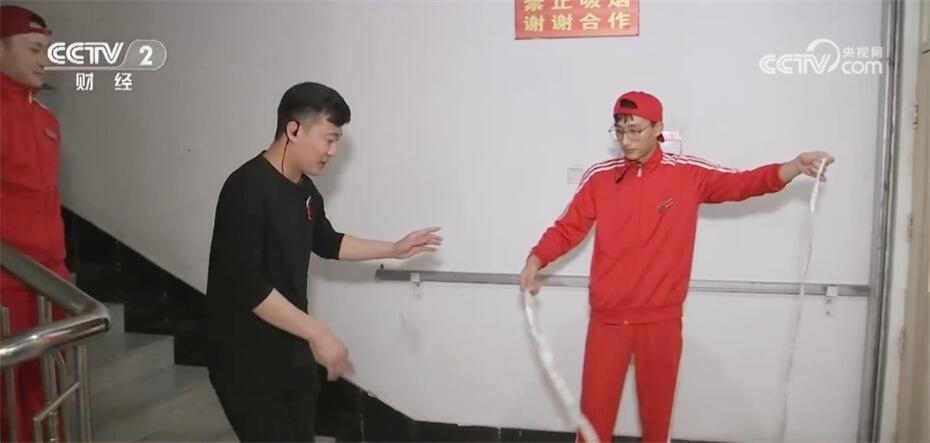 中午兩點(diǎn)左右,史昌換班,可以休息一會兒,趁著這個(gè)空檔,史昌帶上兩個(gè)徒弟去樓梯間訓(xùn)練甩面。甩面是史昌所在火鍋店吸引客流的重要業(yè)務(wù),去年史昌一共帶了3個(gè)徒弟。隨著門店生意日漸紅火,史昌預(yù)計(jì)今年得帶出9個(gè)徒弟。