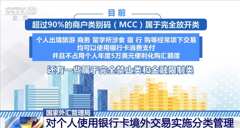 根據(jù)規(guī)定,目前,超過90%的商戶類別碼屬于完全放開類,個人出境旅游、商務、留學所涉食、宿、行、購等經(jīng)常項下交易,均可以使用銀行卡消費支付,并且不占用個人年度5萬美元便利化購匯額度。此外,還有一些屬于完全禁止類和金融限制類。