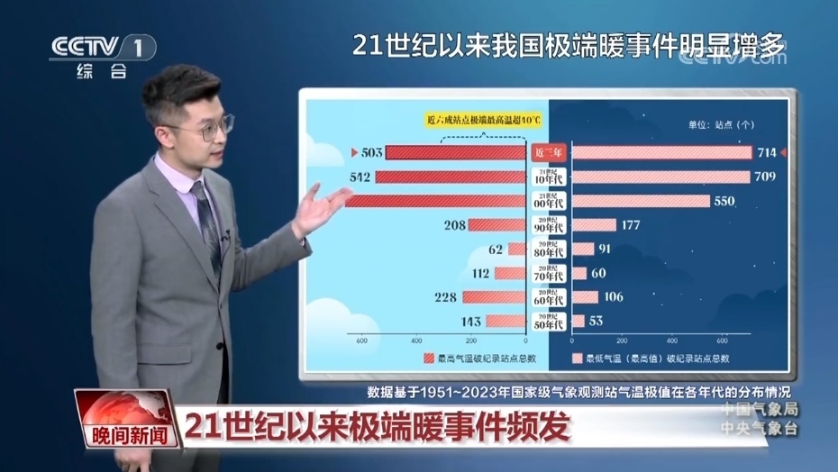 氣象分析師 胡嘯:我們統(tǒng)計了上世紀(jì)50年代以來氣溫創(chuàng)紀(jì)錄的站點,從白天的國家級氣象站創(chuàng)紀(jì)錄站點來看,有百分之七十都出現(xiàn)在21世紀(jì),近三年數(shù)量達到了503個,在這其中有六成站點的極端最高氣溫都突破了40℃。不僅白天的氣溫高,夜間的氣溫也很高,大致有百分之八十的站點都出現(xiàn)在21世紀(jì)。近三年是達到了714個,這要比以往任何十年的累加都要多。
