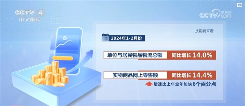 從消費來看,1—2月份,單位與居民物品物流總額同比增長14.0%,實物商品網上零售額同比增長14.4%,增速比上年全年加快6個百分點;快遞業(yè)務量超過230億件,同比增長28.5%,比上年全年加快9.1個百分點。