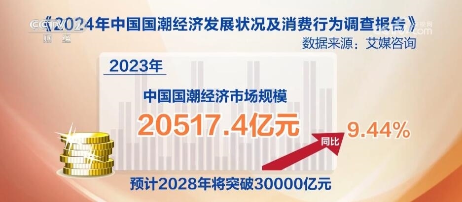據(jù)調(diào)查,2023年中國“國潮”經(jīng)濟(jì)市場(chǎng)規(guī)模為20517.4億元,同比增長9.44%,預(yù)計(jì)2028年將突破30000億元。