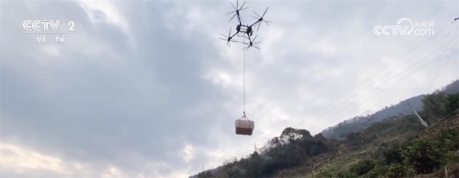 在湖北宜昌興山縣秀龍村,眼下的橙子采收也用上了新工具。裝有鉤子的無(wú)人機(jī)飛到柑橘地上空,村民用鉤子勾住裝有100斤鮮橙的筐子。隨后,無(wú)人機(jī)就將這些鮮橙運(yùn)到了公路邊的貨車上。這樣的無(wú)人機(jī)一天可以運(yùn)輸3萬(wàn)斤橙子,完成了超過(guò)16人的工作量,節(jié)約了2500元以上的成本。