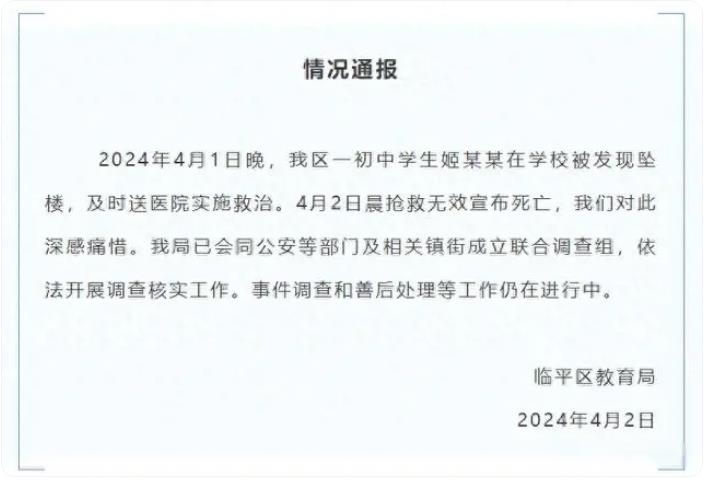 ·杭州臨平教育局通報“一初中學(xué)生在學(xué)校墜樓死亡”:成立聯(lián)合調(diào)查組。