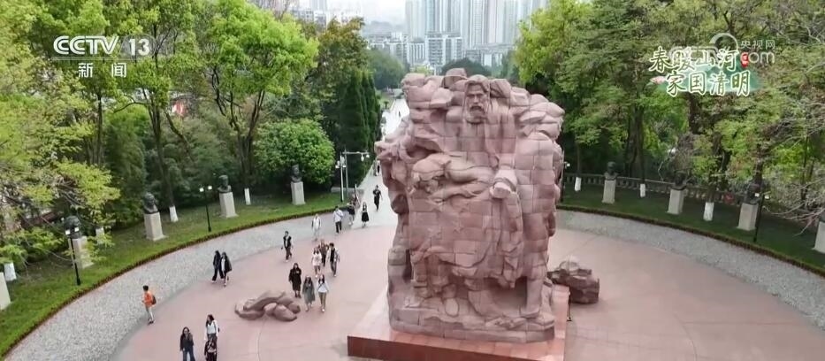 這里是位于重慶市沙坪壩區(qū)的歌樂山烈士陵園。1939年至1949年,以渣滓洞、白公館為主的重慶軍統(tǒng)集中營是國民黨囚禁和屠殺中共黨員、抗日愛國將領(lǐng)、民主人士及其他革命志士的秘密監(jiān)獄。重慶解放后,人民政府將犧牲的300多名英烈遺骸合葬于此,并于1954年建成烈士墓園和烈士紀念碑。在烈士陵園中,聳立著一座由438塊紅色花崗石組成的烈士群雕。人們來到這里獻花祭掃、默哀緬懷,汲取砥礪前行的力量。