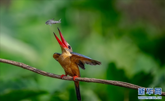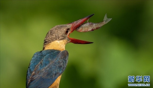 鸛嘴翡翠進(jìn)食瞬間(3月30日攝)。新華網(wǎng)發(fā)(朱邊勇 攝)
