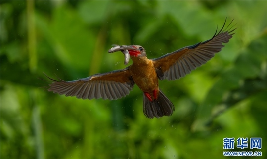 飛翔的鸛嘴翡翠(3月31日攝)。新華網(wǎng)發(fā)(高峰 攝)