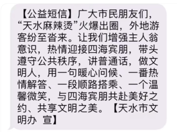 事實上,自3月以來天水在網(wǎng)絡“出圈”后,游客就絡繹不絕。有多位當?shù)鼐W(wǎng)友“曬”的消息顯示,3月20日收到天水市發(fā)布的“公益短信”,建議當?shù)厥忻瘛霸鰪娭魅宋桃庾R,熱情迎接四海賓朋……用一句暖心問候、一番熱情解答、一段順路搭乘、一個溫馨微笑,與四海賓朋共赴美好之約……”