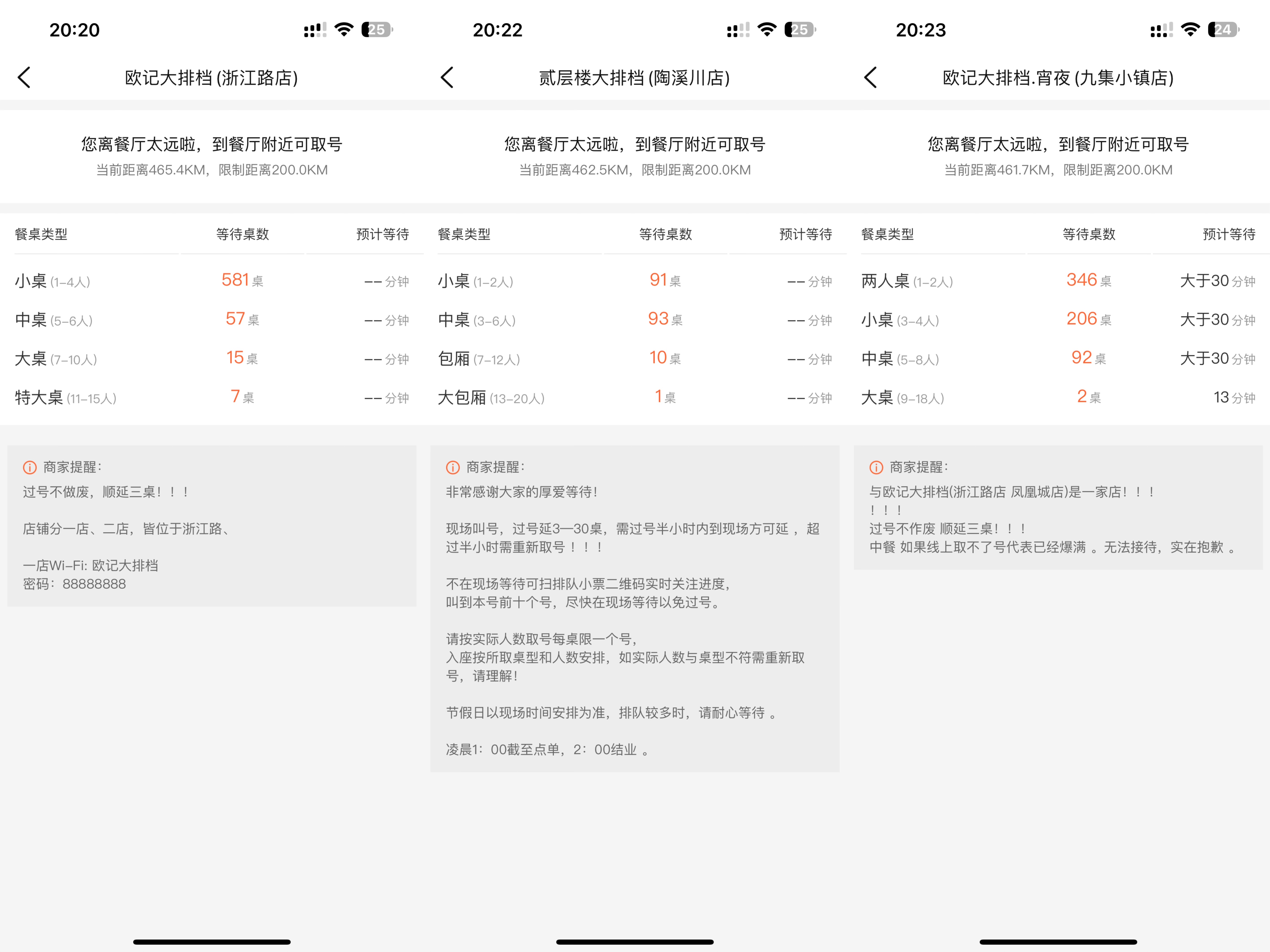 4月4日晚,澎湃新聞在大眾點評上搜索發(fā)現(xiàn),景德鎮(zhèn)多家餐廳爆滿。如截至當日20:20,歐記大排檔浙江路店的小桌需等待581桌,中桌需等待57桌。截至當日20:22,貳層樓大排檔陶溪川店的小桌需等待91桌,中桌需等待93桌。截至當日20:23,歐記大排檔九集小鎮(zhèn)店的兩人桌需等待346桌,小桌需等待206桌,中桌需等待92桌。