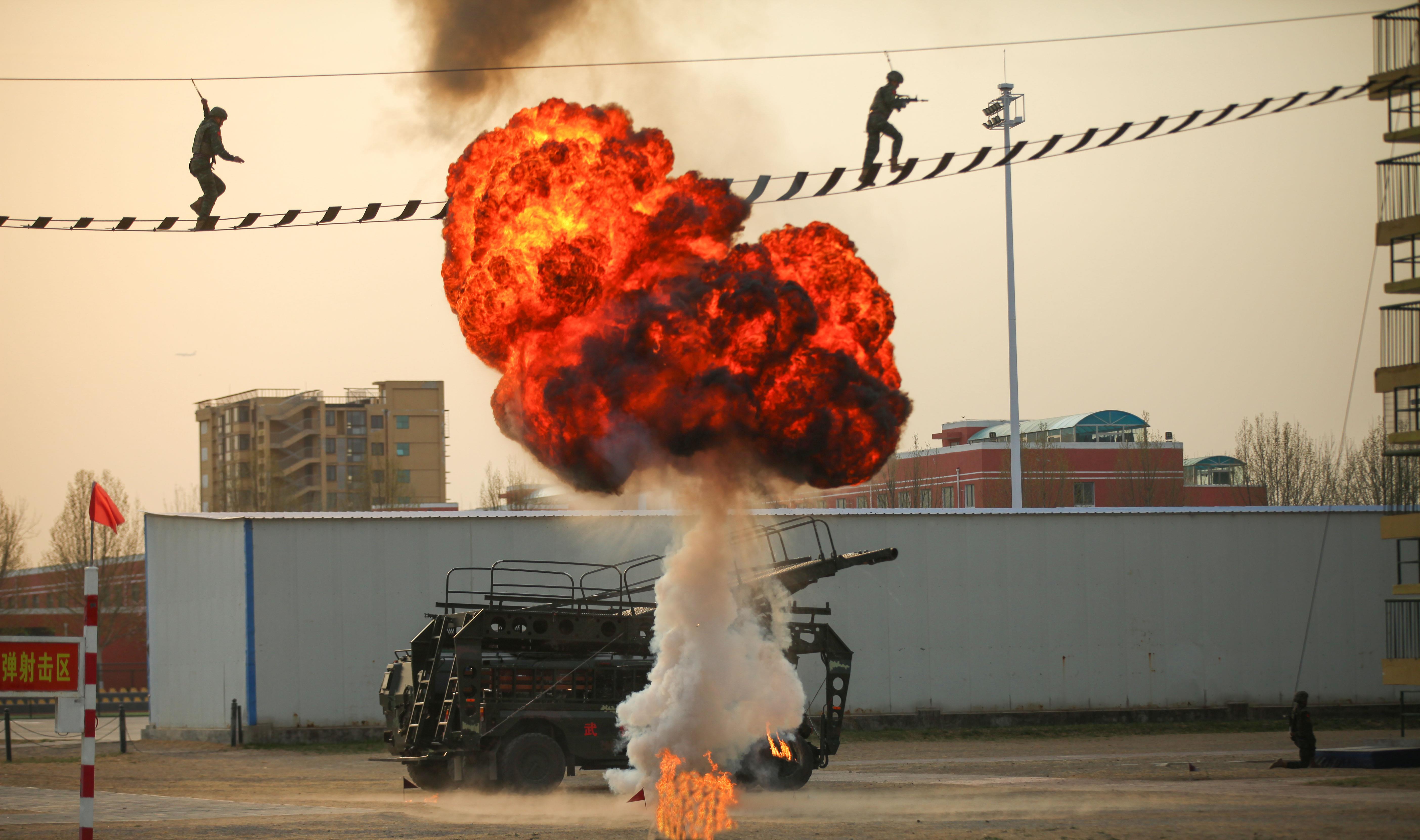 硝煙、炮火聲中,特戰(zhàn)隊(duì)員通過云梯、鋼索等,快速抵達(dá)任務(wù)區(qū)。在無人機(jī)和突擊裝備加持下,實(shí)戰(zhàn)化訓(xùn)練的攻擊體系更加立體,火力打擊更加精準(zhǔn),指揮協(xié)同更加集成。在不遠(yuǎn)處,“從這里走向戰(zhàn)場”的大字,熠熠生輝。