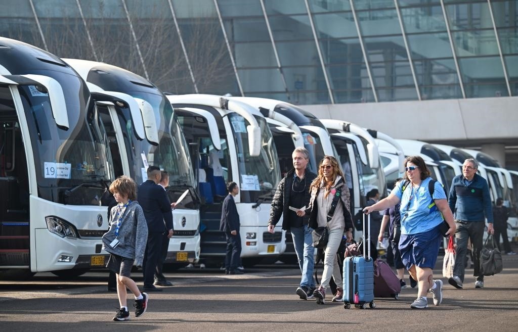 4月7日,外籍旅客準(zhǔn)備搭乘大巴車前往京津旅游景點。新華社記者 孫凡越 攝