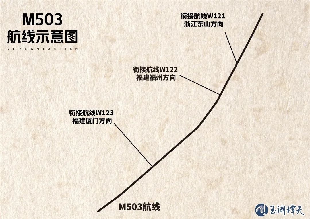 這樣的背景下,在經(jīng)過國際民航組織(ICAO)核準(zhǔn)后,這條代碼為M503的新航線正式落地,與之相配套的還有三條銜接航線,即飛往浙江東山的W121、飛往福建福州的W122和飛往福建廈門的W123。