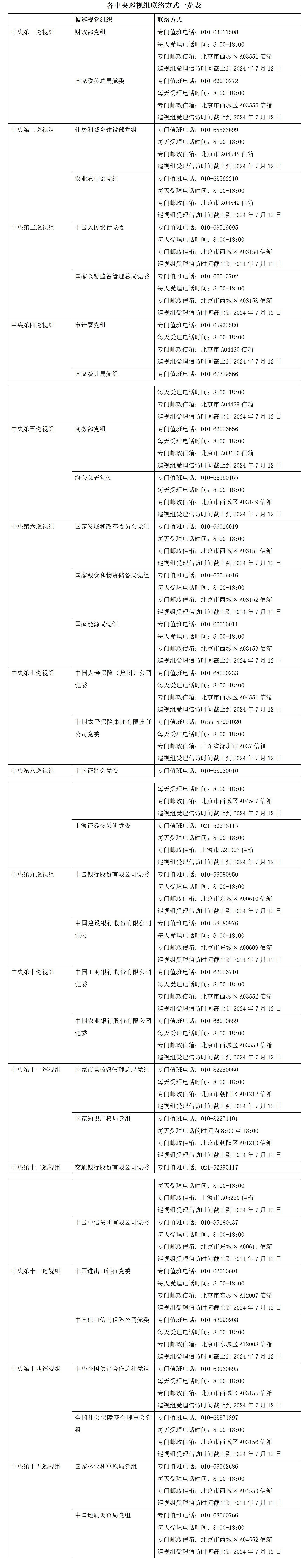 根據(jù)黨中央關(guān)于巡視工作統(tǒng)一部署,二十屆中央第三輪巡視的15個(gè)巡視組陸續(xù)開始進(jìn)駐被巡視單位。目前,中央巡視組已進(jìn)駐31家單位并公布了聯(lián)系方式。據(jù)了解,中央巡視組將在被巡視黨組織工作3個(gè)月左右。