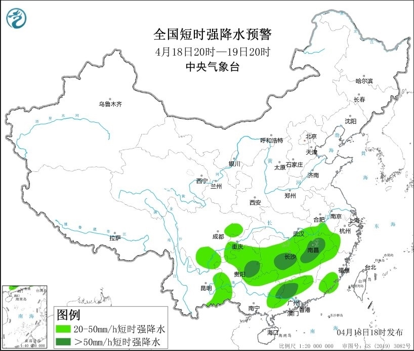 預(yù)計(jì)4月18日20時(shí)至19日20時(shí),貴州中東部、湖南中南部、江西、浙江西南部、廣西北部、廣東北部、福建南部等地的部分地區(qū)將有8-10級(jí)雷暴大風(fēng)或冰雹天氣,其中貴州東部、湖南中南部、江西中北部、廣西東北部、廣東北部等地的部分地區(qū)將有10級(jí)以上雷暴大風(fēng),局地風(fēng)力可達(dá)11級(jí)以上;四川東部和南部、重慶南部、貴州、湖北東南部、安徽南部、湖南、江西、浙江西部、福建西北部和南部、云南東南部、廣西東北部、廣東北部等地將有小時(shí)雨量大于20毫米的短時(shí)強(qiáng)降水天氣,其中貴州東部、湖南中南部、江西中部、廣東中北部等地的部分地區(qū)最大小時(shí)雨量大于50毫米,局地可達(dá)70毫米以上。