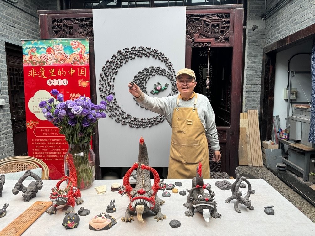 江蘇省非物質文化遺產泥塑傳承人周寶康展示他的泥塑作品“太平泥叫叫”