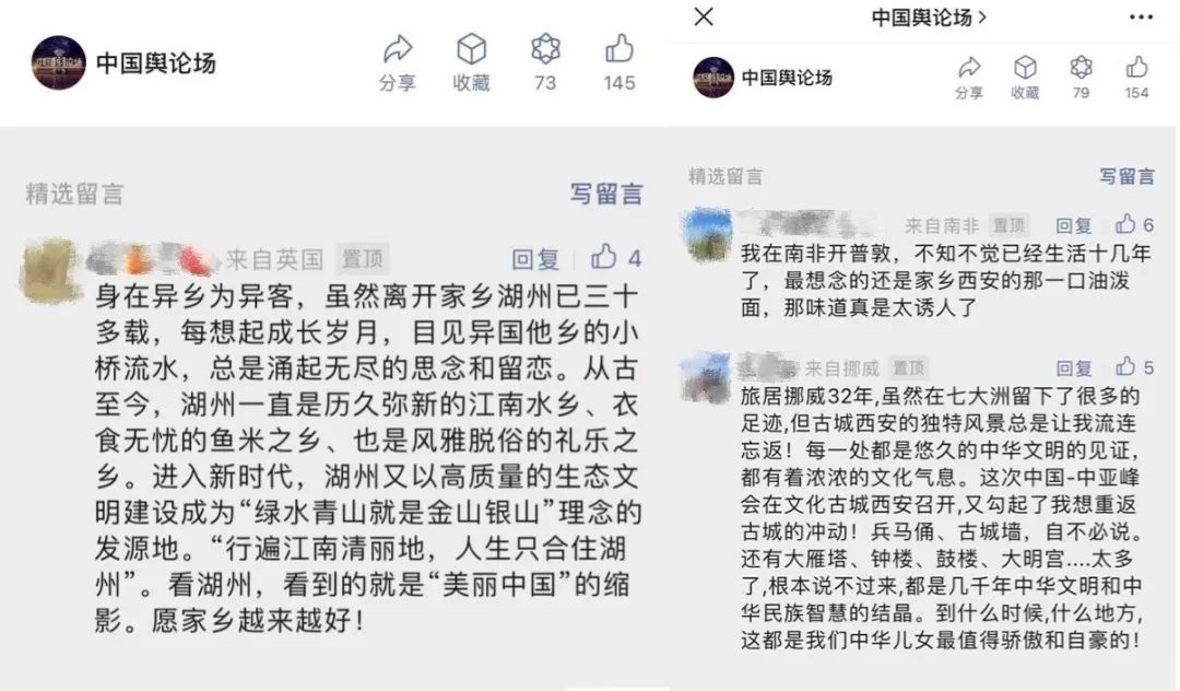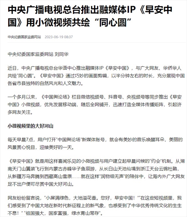 “早安中國(guó)切口新穎,有文化屬性和微記錄的氣質(zhì)。”“每次片尾的結(jié)語字幕,都是從哪里選的?每天,都給我學(xué)習(xí)的機(jī)會(huì)?!薄皩I(yè)微記錄是媒體融合最寬廣的路?!薄对绨仓袊?guó)》真真切切地緩解了許多海內(nèi)外網(wǎng)友的故土思鄉(xiāng)情切,也收到了來自四面八方的認(rèn)可及反饋?!吨袊?guó)輿論場(chǎng)》節(jié)目持續(xù)發(fā)出“游子看故鄉(xiāng)”征集令,請(qǐng)海外華僑華人說出對(duì)家鄉(xiāng)的思念和心中最想“打卡”的祖國(guó)美景。