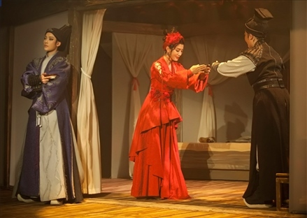 新國(guó)風(fēng)環(huán)境式越劇《新龍門客棧》起初在短視頻平臺(tái)走紅,熱度從線上傳導(dǎo)至線下,許多從未接觸過(guò)越劇的觀眾走入劇場(chǎng)。環(huán)境式劇場(chǎng)不同于傳統(tǒng)劇場(chǎng)的鏡框式舞臺(tái),舞臺(tái)不只是面前的一塊區(qū)域,而是實(shí)現(xiàn)了觀眾“身在其中”,濃厚的“氛圍感”撲面而來(lái)。