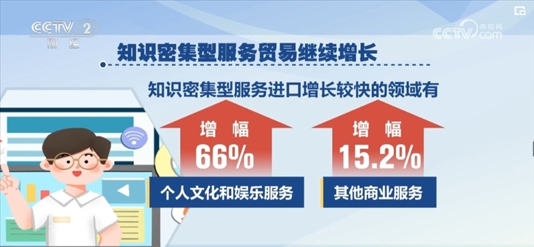 知識密集型服務貿(mào)易繼續(xù)增長。2024年一季度,知識密集型服務進出口7332.6億元,增長5.6%。其中知識密集型服務出口增長較快的領域有知識產(chǎn)權(quán)使用費、個人文化和娛樂服務,增幅分別為34.4%、19%;知識密集型服務進口增長較快的領域有個人文化和娛樂服務、其他商業(yè)服務,增幅分別為66%、15.2%。