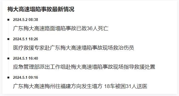 據(jù)廣東梅州大埔縣委宣傳部消息,5月1日凌晨2時(shí)10分許,梅大高速往福建方向K11+900m附近發(fā)生高速公路路面塌陷事故。至5月2日早上5時(shí)30分,已發(fā)現(xiàn)23輛車(chē)陷落,36人死亡,30人受傷(無(wú)生命危險(xiǎn))。