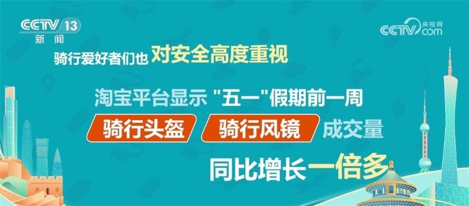 京東數(shù)據(jù)顯示,“五一”前半個月,公路自行車和電助力自行車銷售額的增幅最大,同比增長了兩倍多。騎行服、騎行穿戴裝備、自行車配件的銷售也同比增加一倍多。騎行愛好者們也對安全高度重視,淘寶平臺顯示,“五一”假期前一周,騎行頭盔和騎行風鏡的成交量也同比增長一倍多。