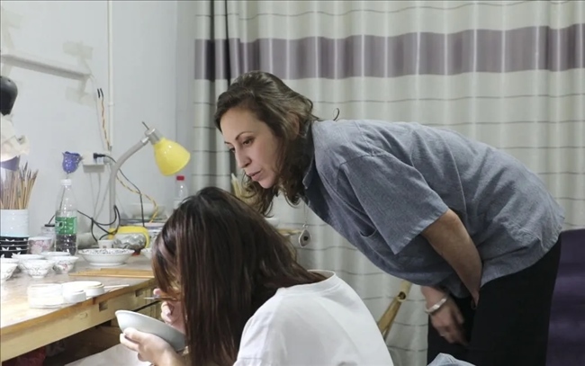 法國陶瓷藝術家開彌在觀看陶瓷匠人創(chuàng)作。新華社記者 程迪 攝