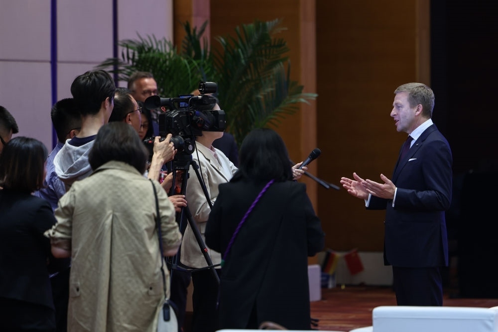 2024年4月26日,遼寧省沈陽市與寶馬集團深化戰(zhàn)略合作簽約儀式在沈陽舉行,這是寶馬集團董事長齊普策接受采訪。新華社記者 潘昱龍 攝