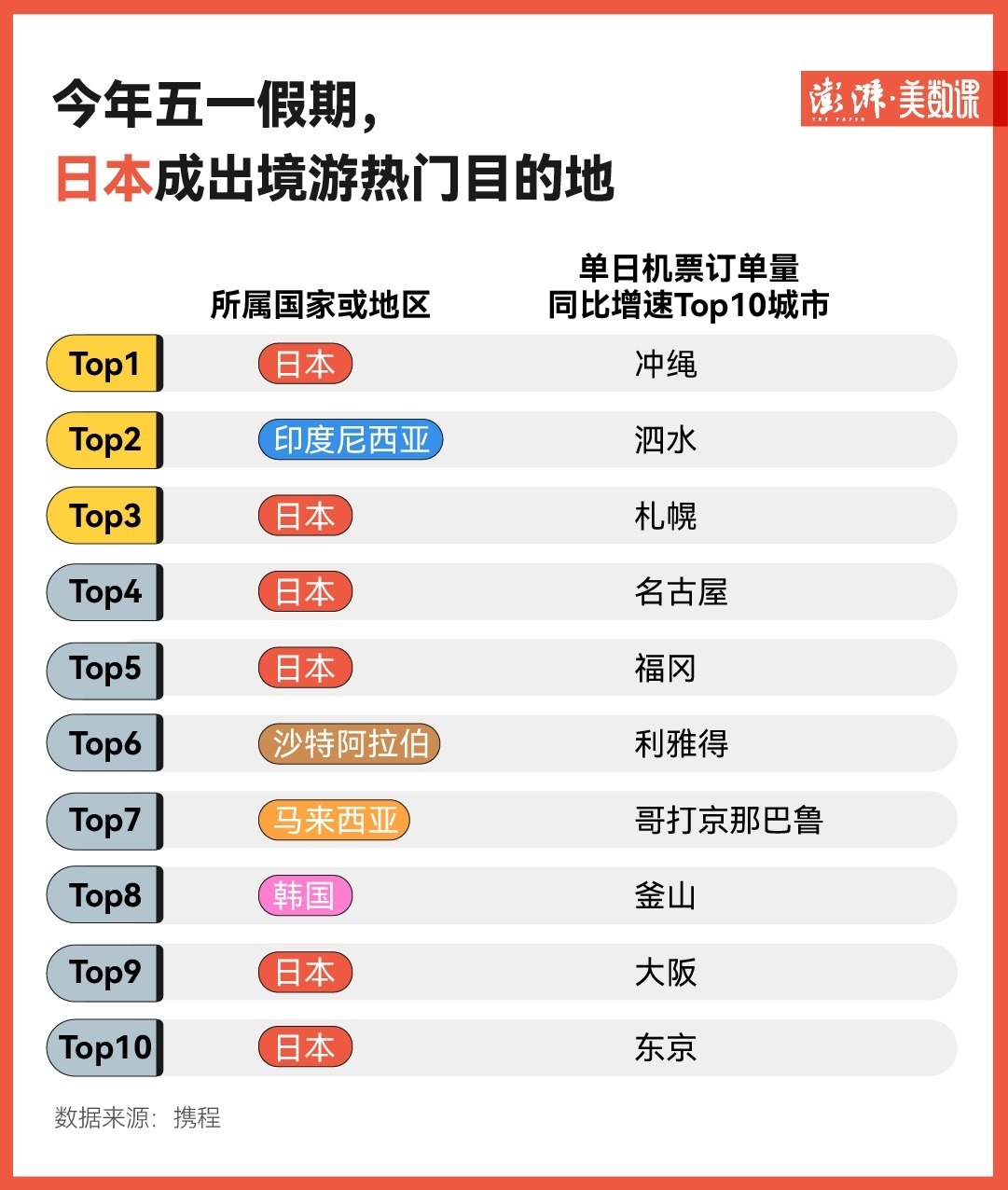 除了國(guó)內(nèi)旅游市場(chǎng)的火爆之外,“五一”出境游已經(jīng)加快復(fù)蘇。從攜程提供的數(shù)據(jù)看,今年“五一”假期,日本成了出境游熱門(mén)目的地——相比2023年同期,單日機(jī)票訂單量同比增速Top10的城市中,日本的沖繩、札幌、名古屋等城市分別占據(jù)了六個(gè)席位。
