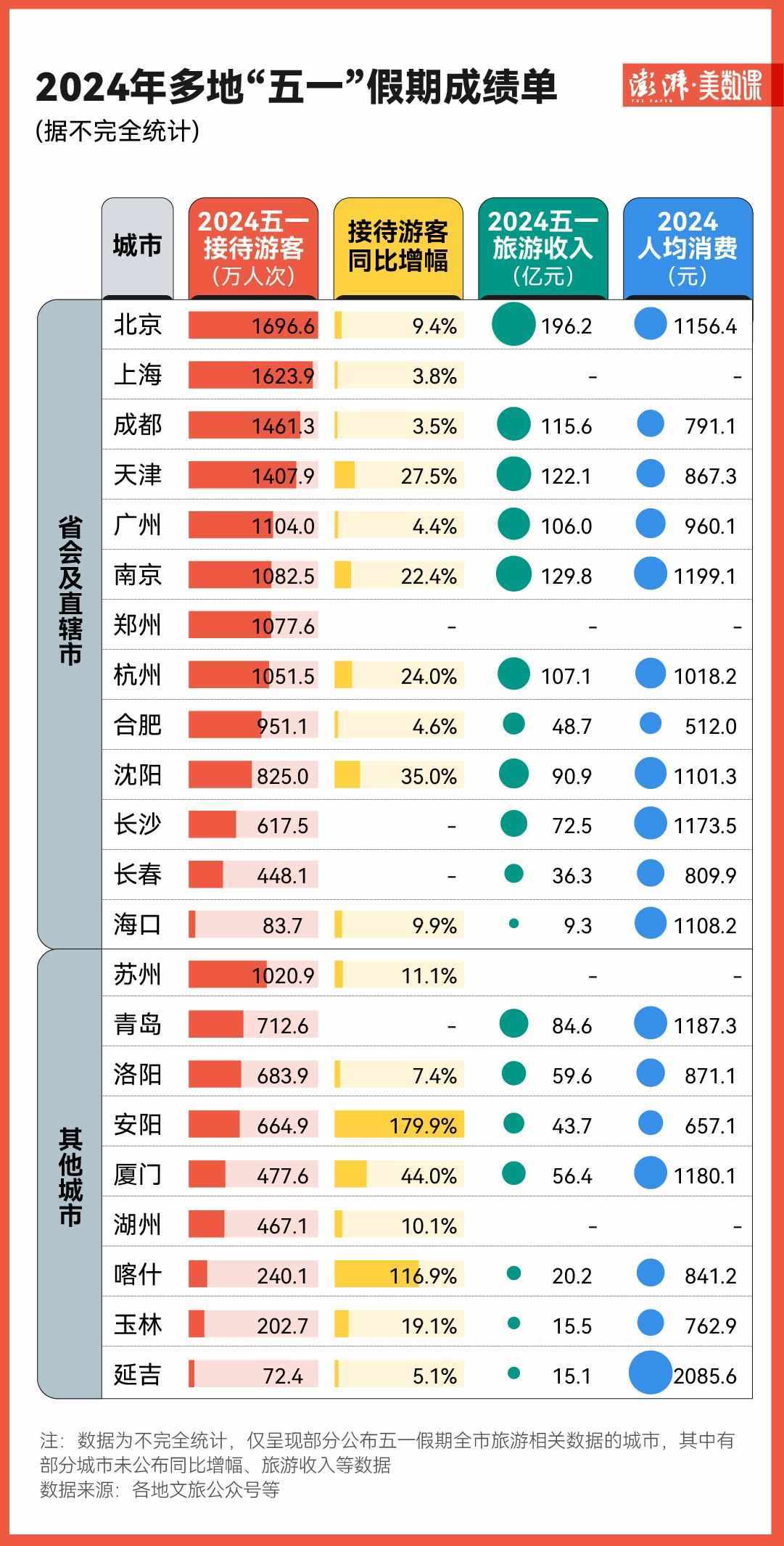 不過(guò),像是北京、上海、成都、天津等城市依然是熱門(mén)的旅游目的地。在目前已公布“五一”假期數(shù)據(jù)的省會(huì)及直轄市中,北京、上海就以1696.6萬(wàn)、1623.9萬(wàn)接待游客人次名列前茅。