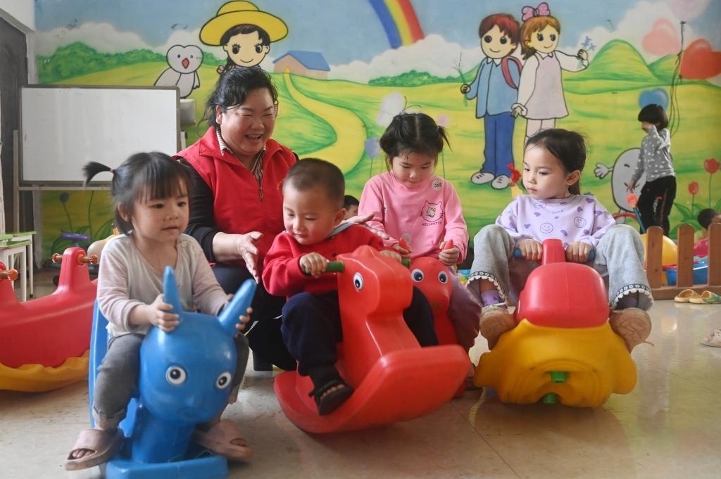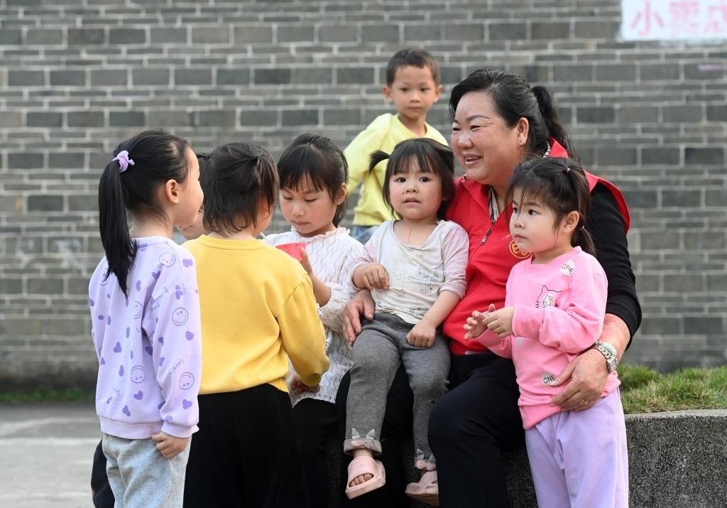 ?↑在廣西賓陽(yáng)縣中華鎮(zhèn)的一個(gè)“留守兒童之家”,張清秀和孩子們一起玩耍(2024年3月5日攝)。